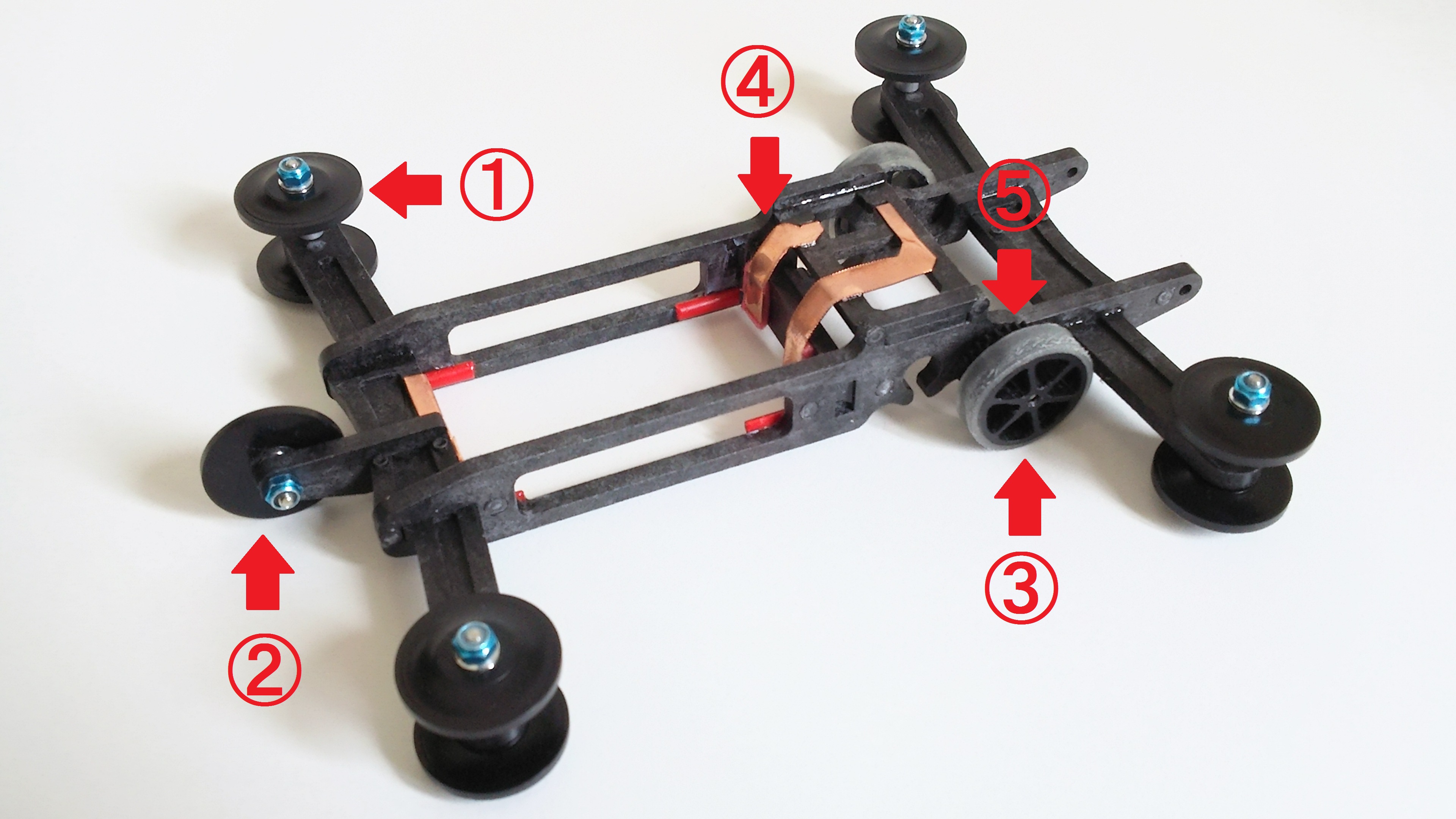 ・フロント(順方向ならノーズ側、逆方向ならモーター側)のローラーにスラスト角をつける。