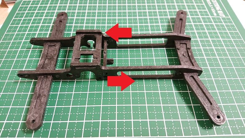 下図矢印部分の突起が、フレームを乗せている板に接するように取り付けます。