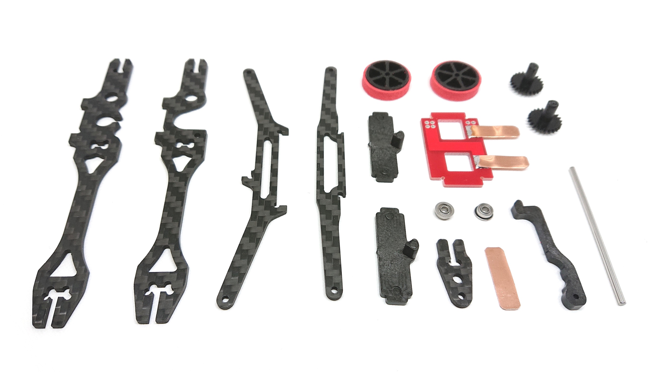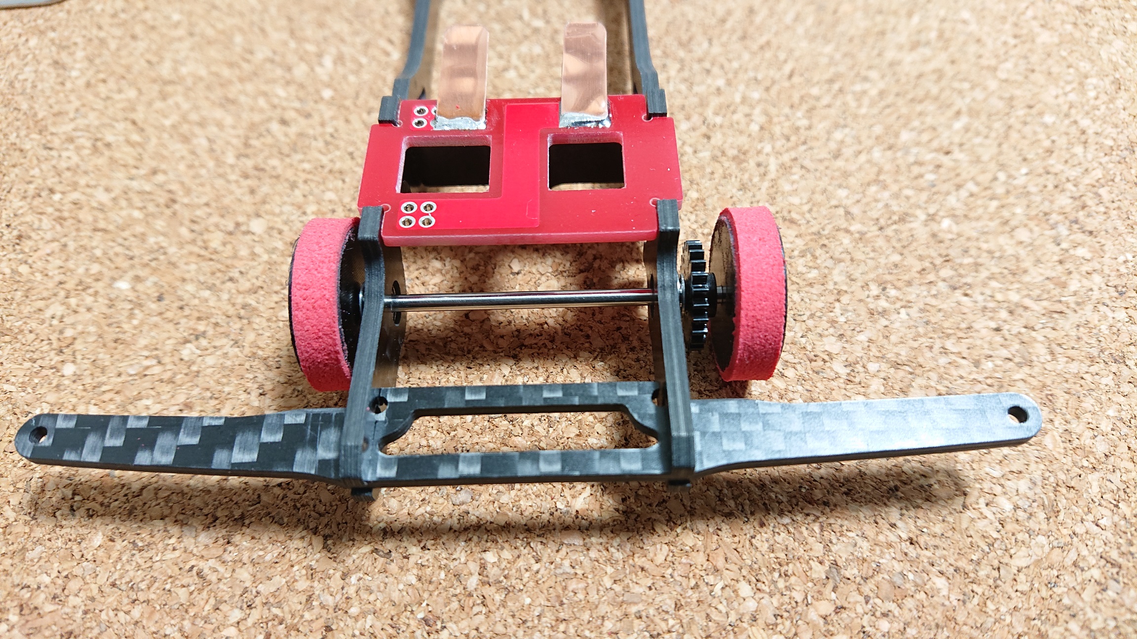これをモーター側に取り付け、ミニ四駆のオレンジ(両軸用)のギアをタイヤ側に取り付けることで駆動系を組むことが出来ます。