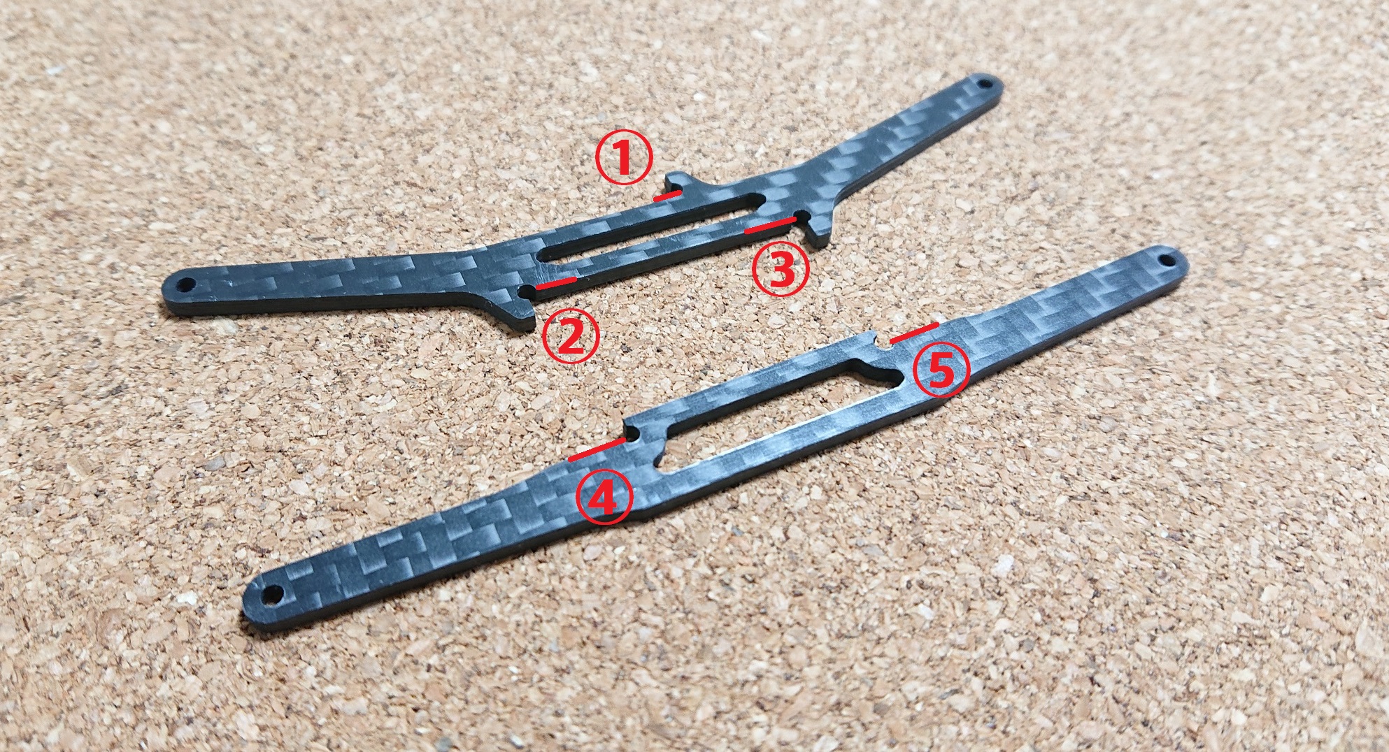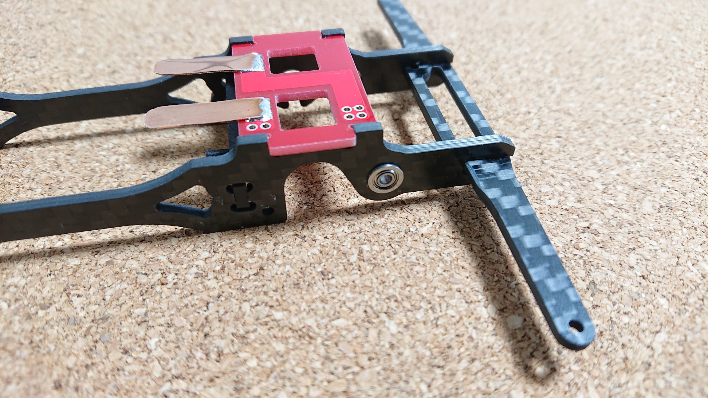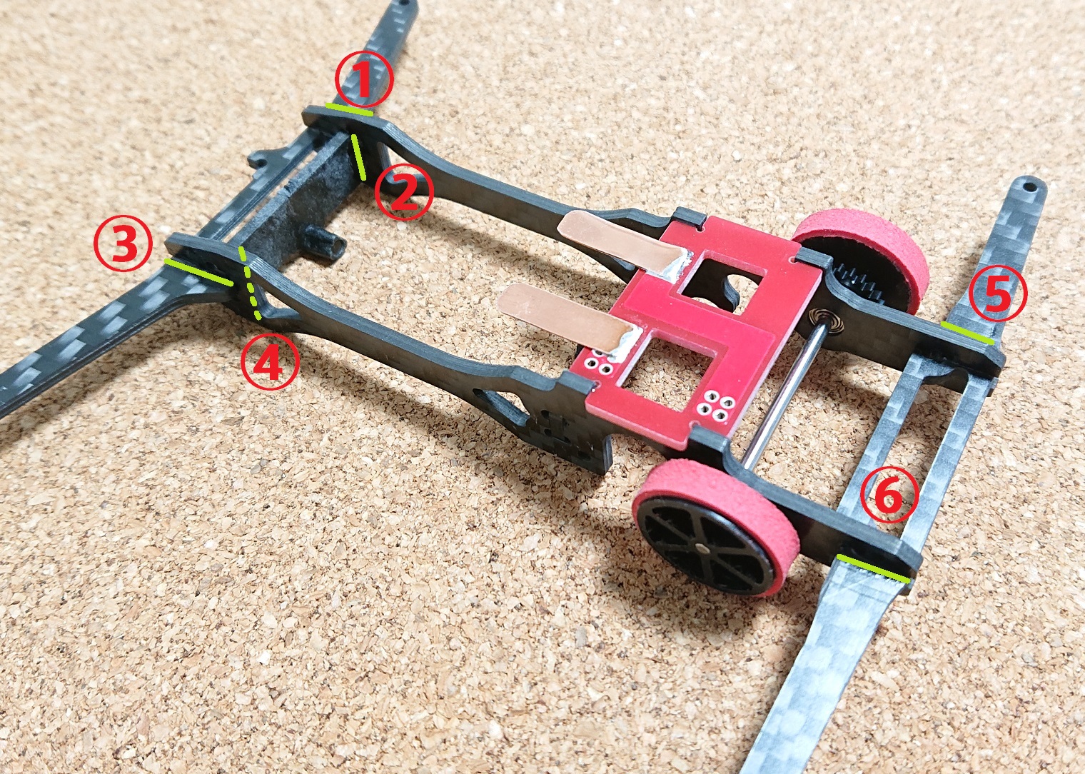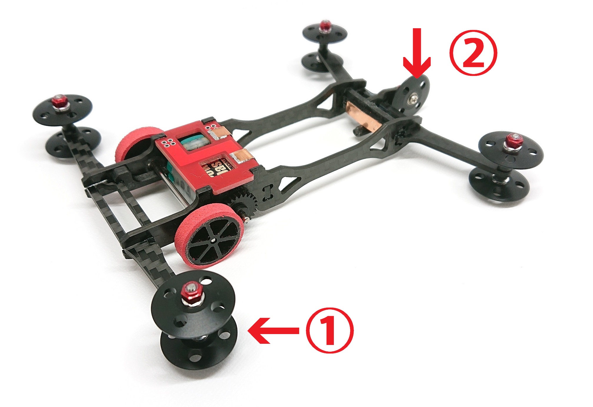 ただローラーを取り付けただけではコースアウトしますので、フロント側のローラーにスラスト角(ローラーの先が下に向かって傾くように角度をつけて固定)をつけてください。
