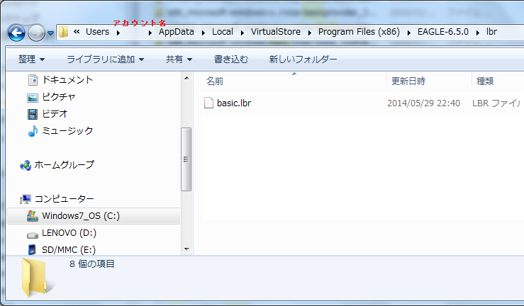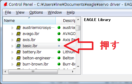 ●使用方法 下図のフォルダにダウンロードしたライブラリーファイルを保存します。(win7の場合) 読み込みを許可するために、EAGLEからライブラリ名の横の丸ボタンを押す。 みどり色になればOK