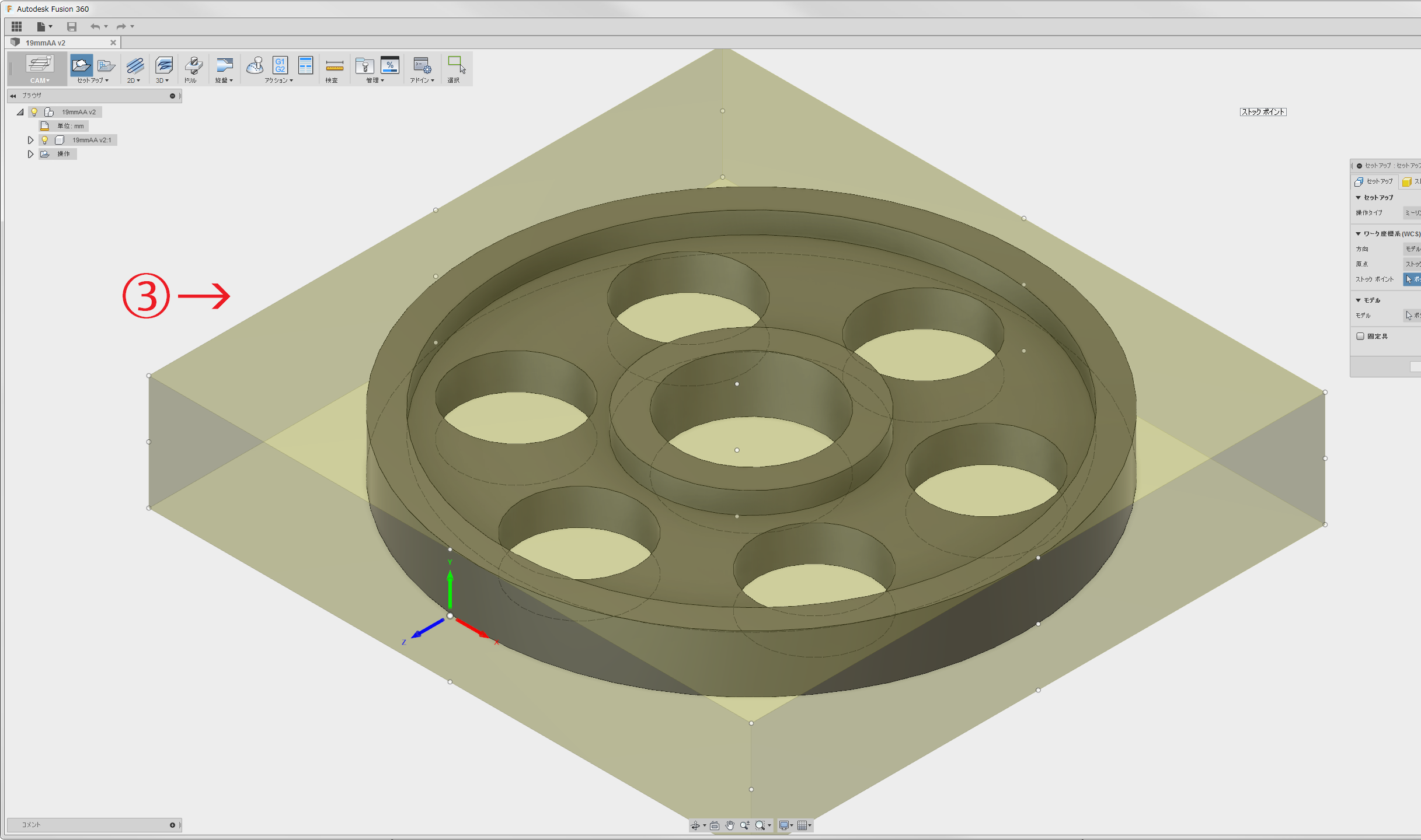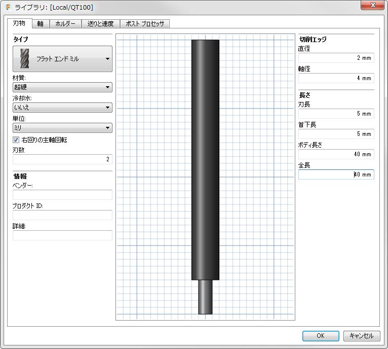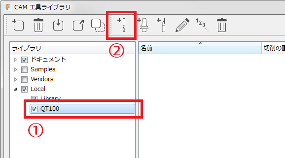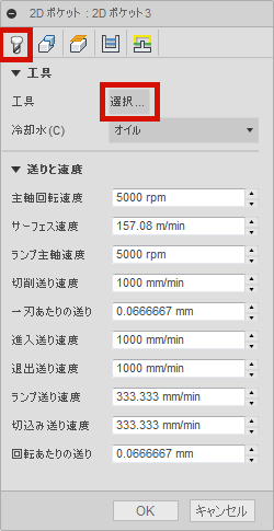 「「工具ライブラリ」の設定」で設定した刃物を選択します。