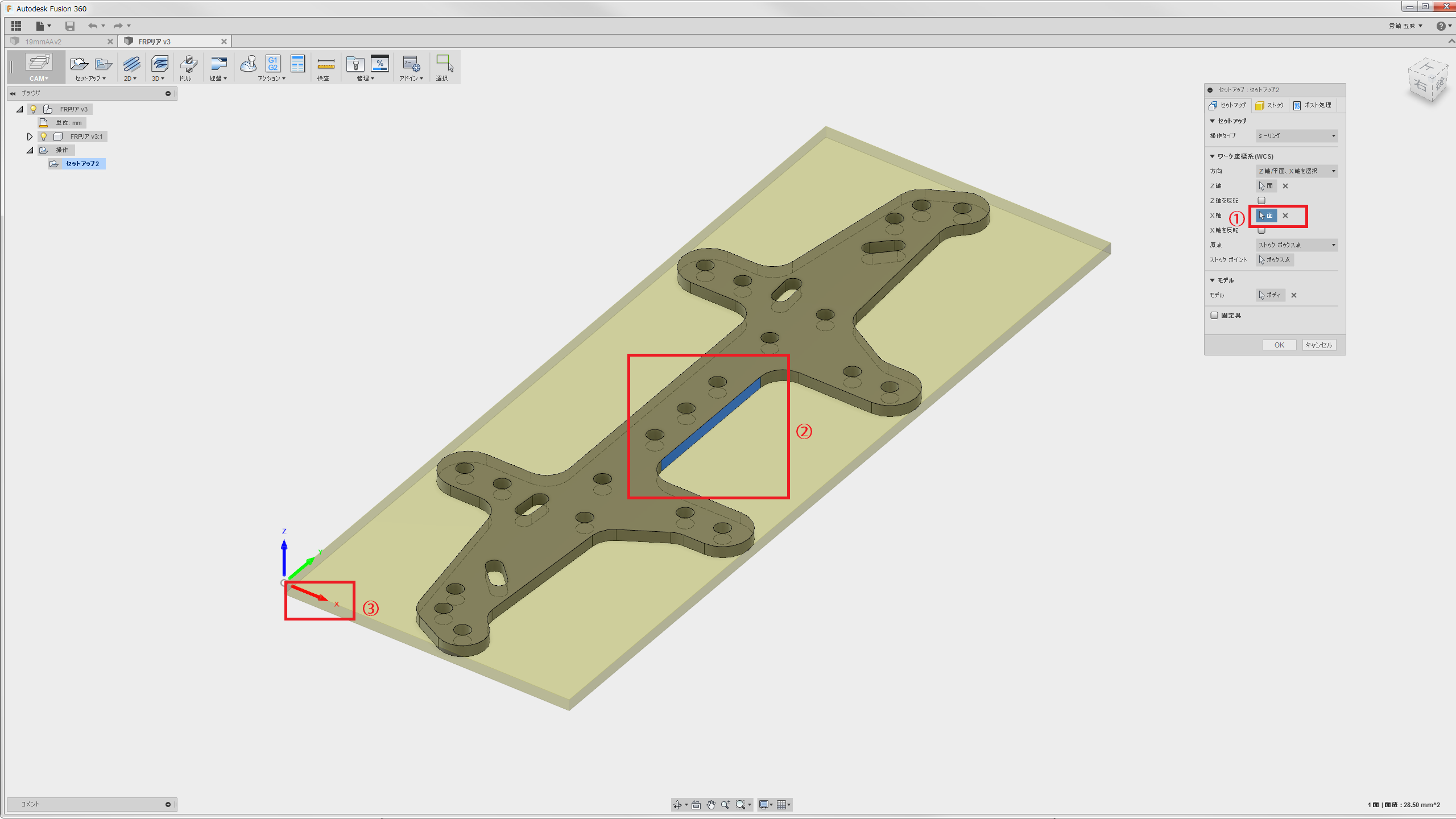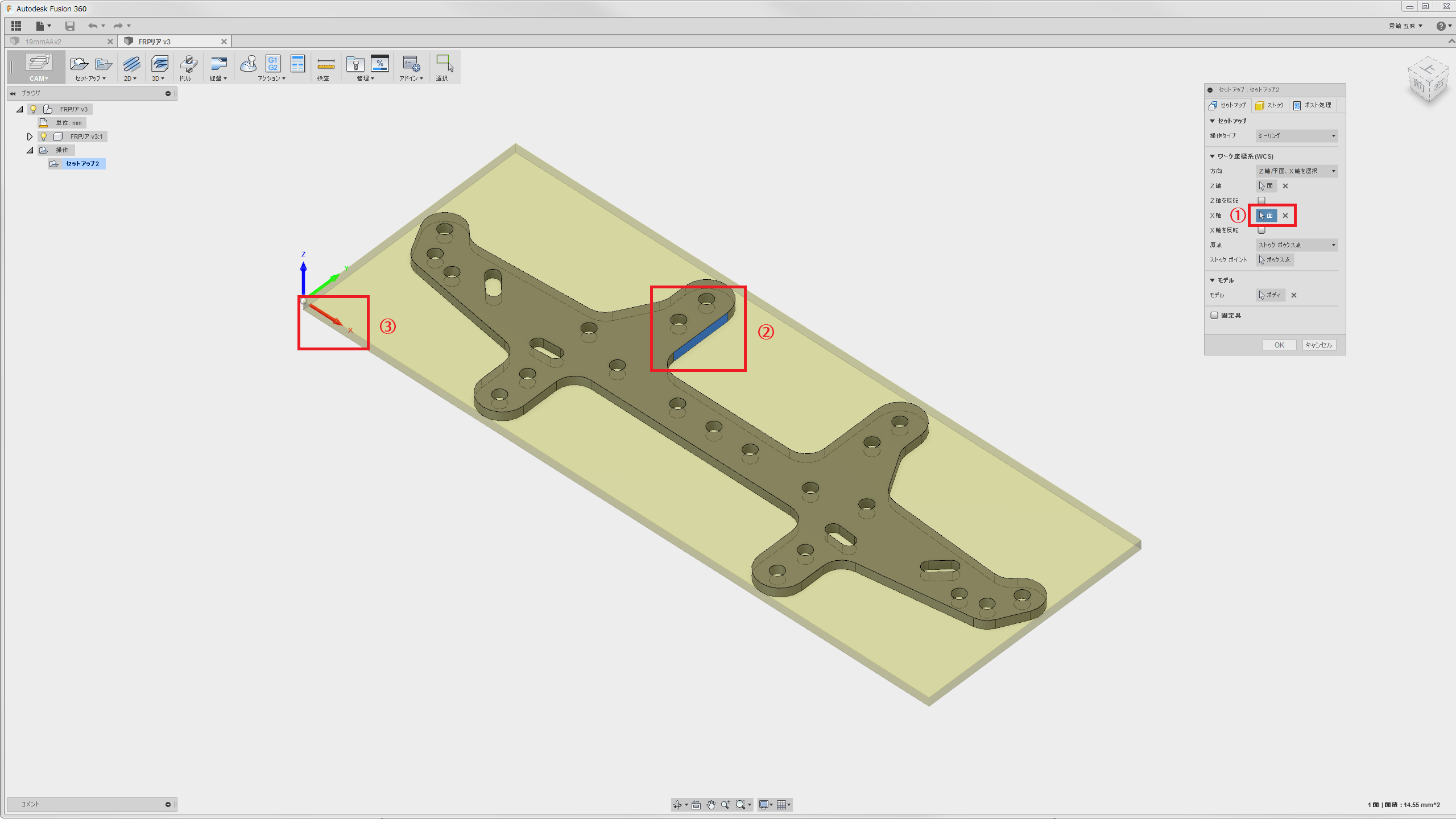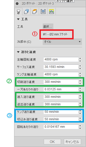 KitMillQt100でジュラルミン(A2017)を削る場合には、0.1mmずつ形を整えながら加工していきますので、「最大粗取り切り込みピッチ」「仕上げ切り込みピッチ」共に0.1mmに設定する必要があります。