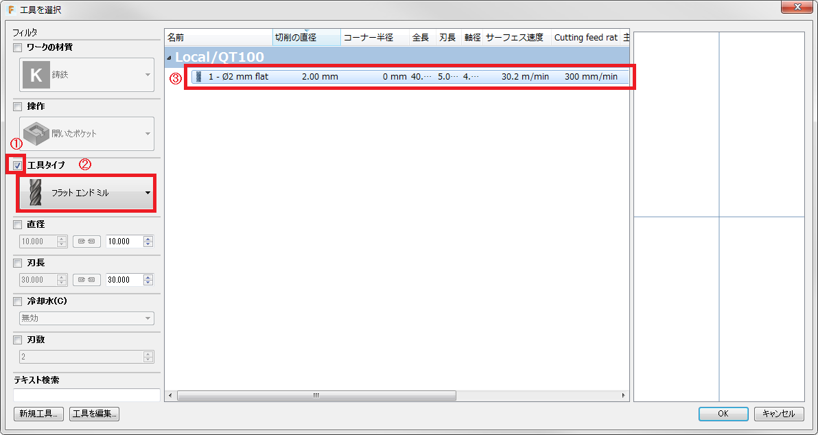 2でスクエアエンドミルを選択しないと、一切刃物が出てこない状態になると思います。