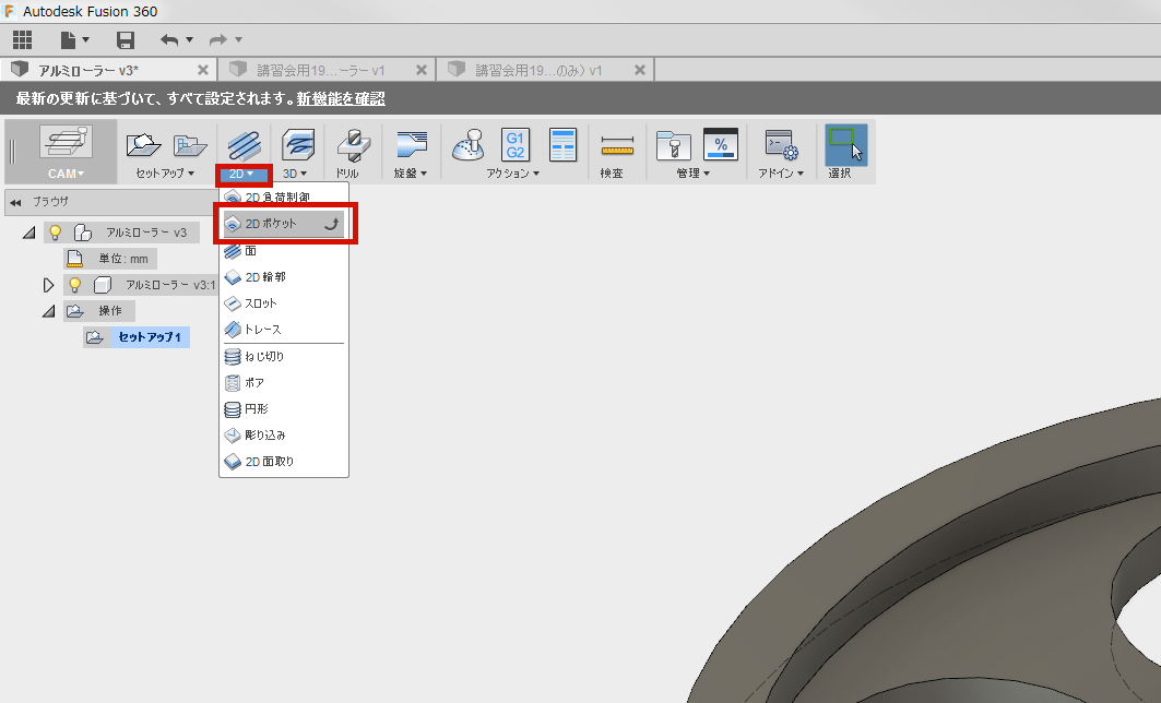 まずは「2D▼」の中から、「2Dポケット」を選択します。
