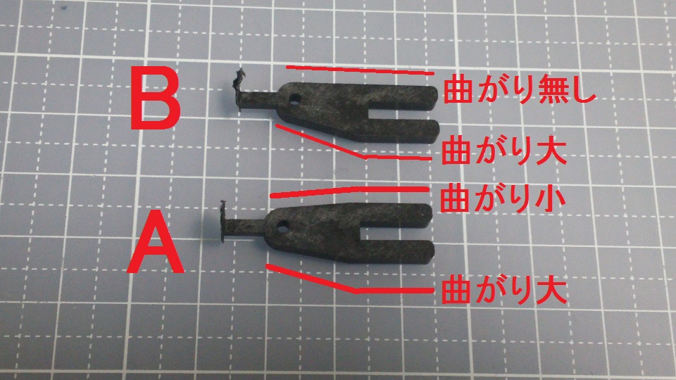 フレームの形状を見て、「曲がり大」がコース床側(車体下側)になります。