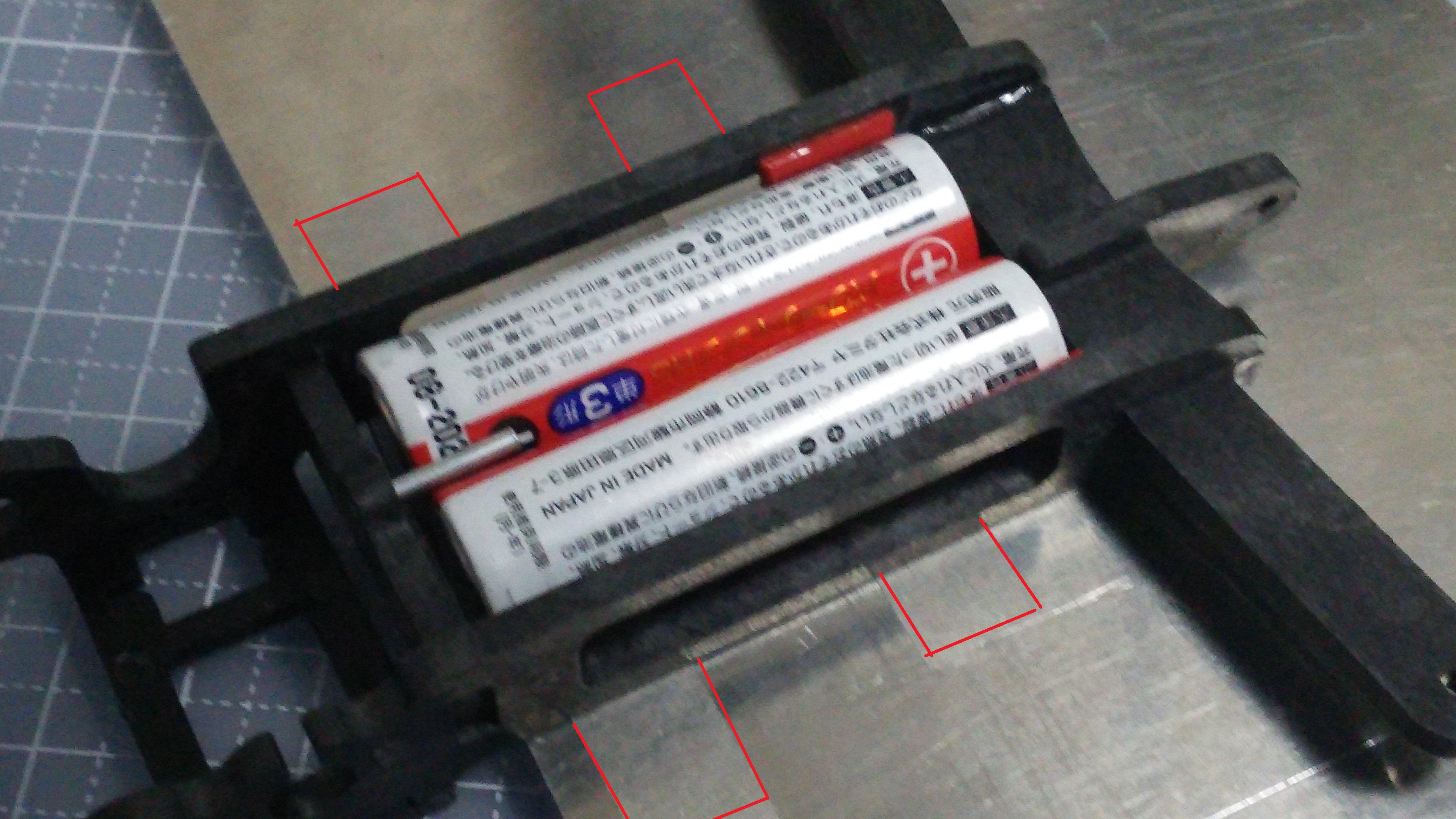 揃えると言っても難しいので、車体をひっくり返し、図中斜線部と電池をテーブルなどの平らなところに押し付けてください。