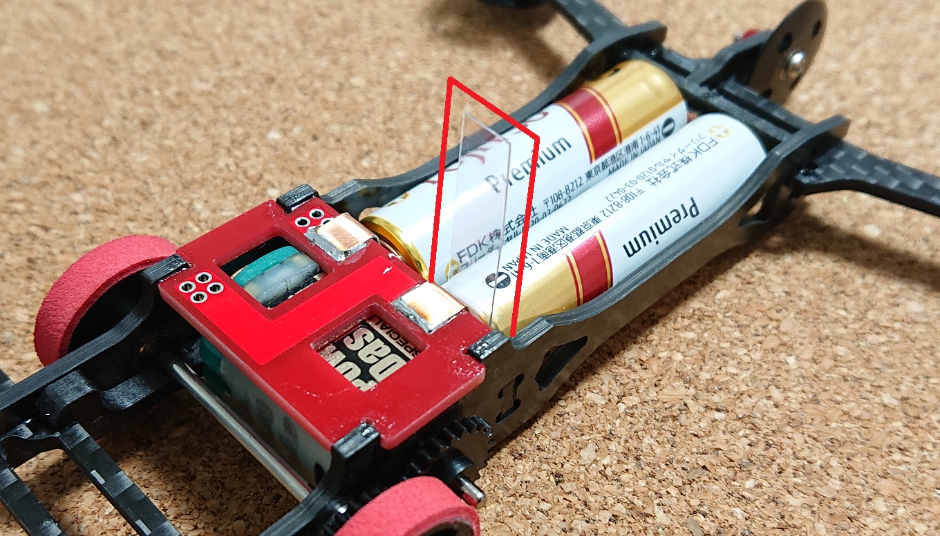 この車体にはスイッチがないので、電池とターミナルの間に絶縁体を挟み(下図赤線部)、モーターに電力が供給されないようにします。