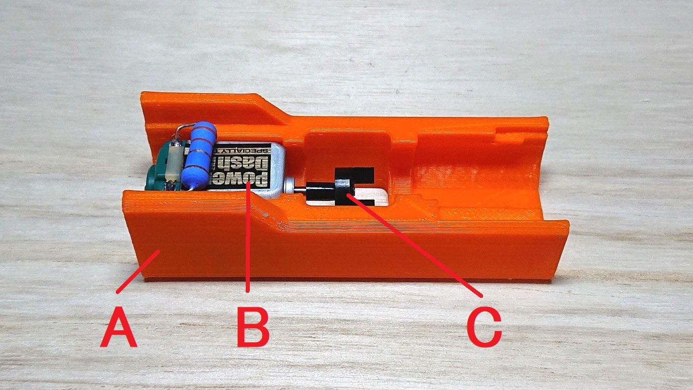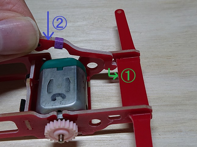 モーターを固定します。「モーター固定用のパーツ」を以下の手順で差し込みます。