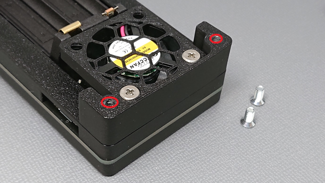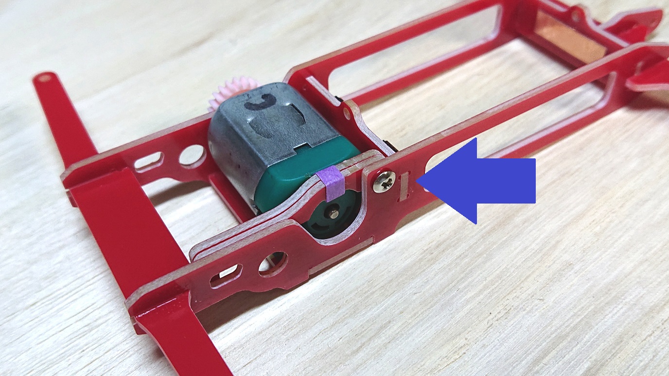 M2×5のネジを使って「モーター固定用のパーツ」を固定します。